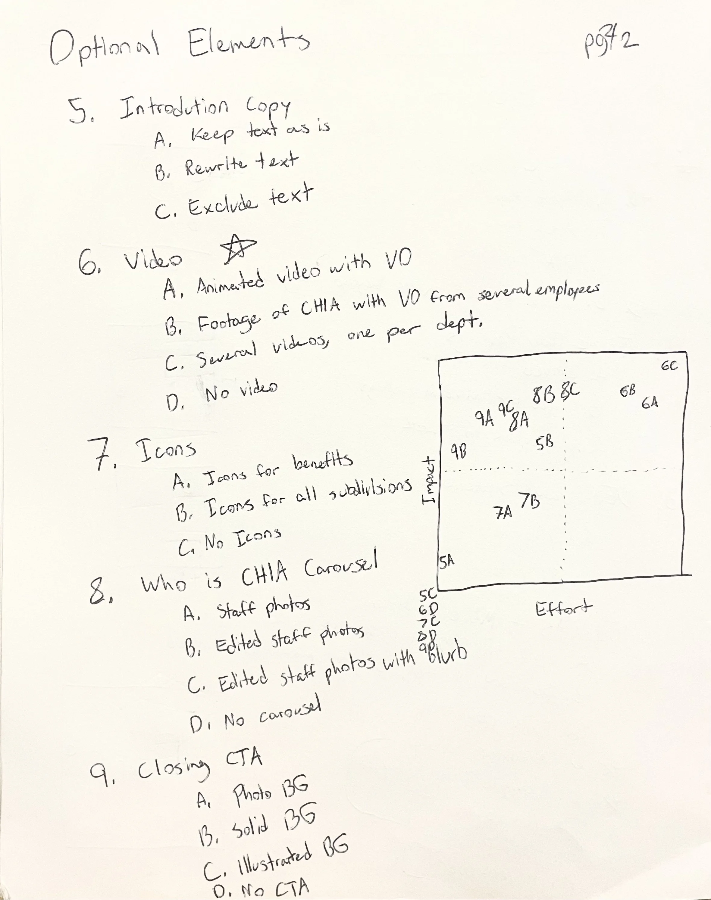 I made use of effort-impact matrices to visually see the level of work and benefit each element would have.