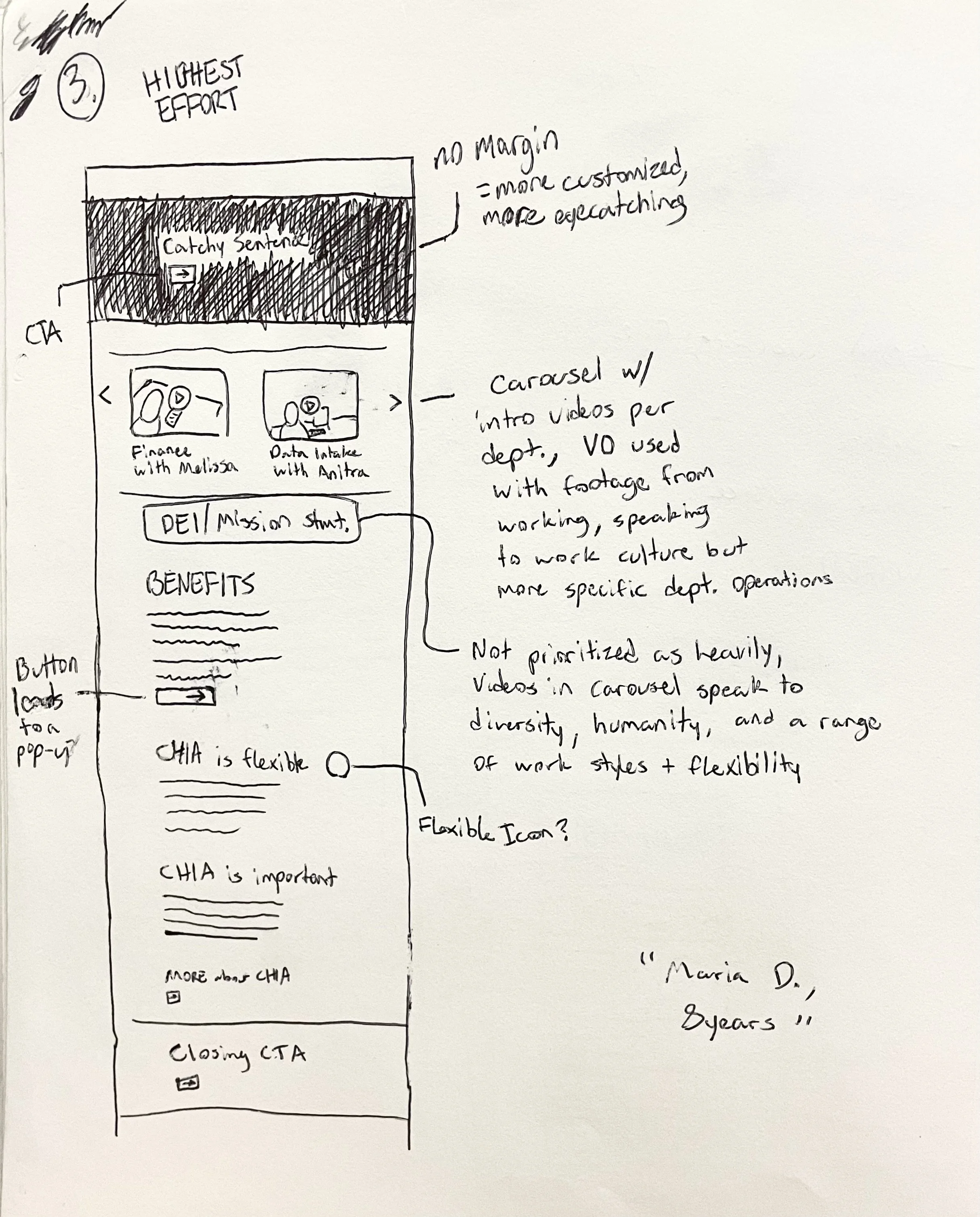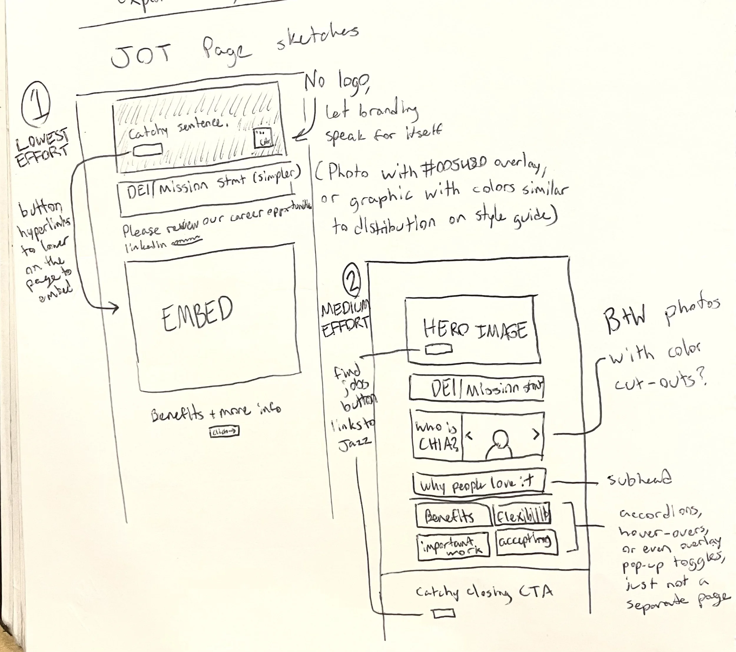 The website itself was constructed with limitations from the developers, meaning certain design options would require special coding or not be currently possible. Despite this, I wanted to see my ideas through and give possibilities if the website were able to support them in the future. I created sketches for three different “Join Our Team” Pages with varying degrees of possibility/effort, giving flexibility to the web and management team regardless of how much bandwidth they have. Here are the sketches: