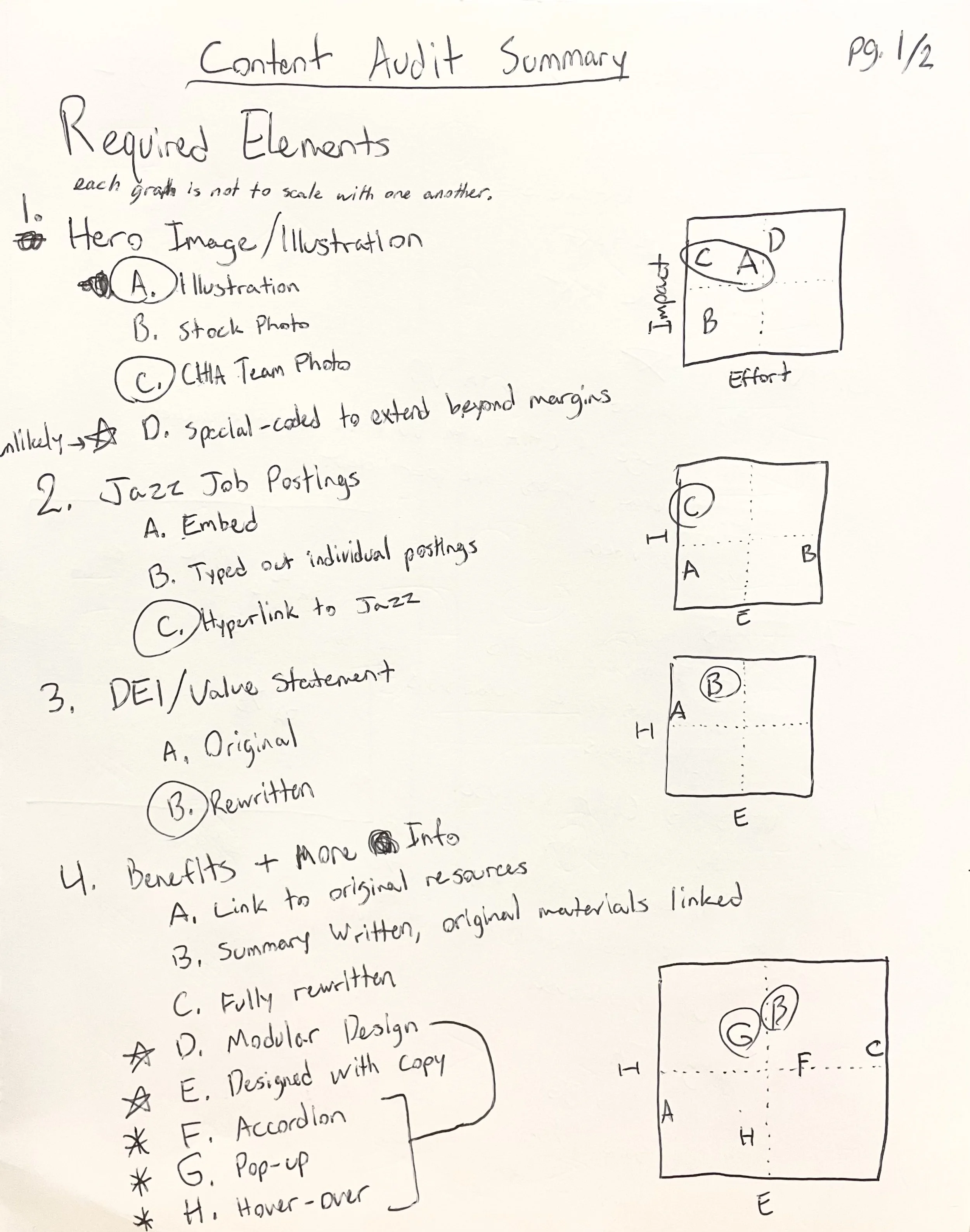 I compiled the best ideas into a list, then used this list to help create a content audit that includes potential features as well as existing ones—I called it an ideated content audit. This allowed me to organize my thoughts and evaluate the best options, whether they be left as they were from the previous page or changed entirely. Here is my audit:
