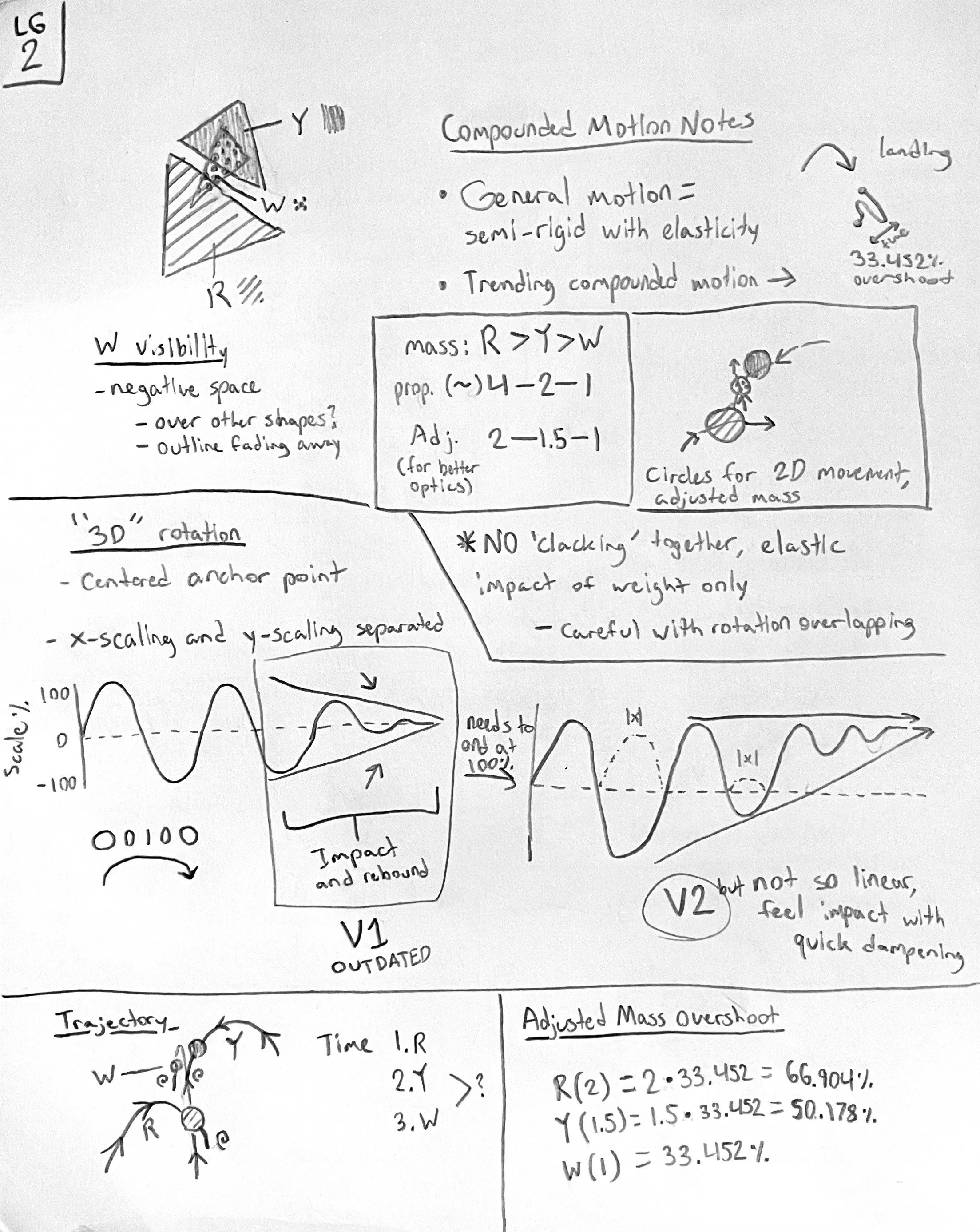 Calculating the movement of the sections began with several estimations, including the perceived weight of the pieces and the graphs that needed to be made. The biggest of these graph concerns was how well depth can be communicated in 2D animation, using X and Y scaling to distort was first planned on paper, then translated to After Effects. Many of my calculations offered a useful framework, however, many of them also needed further adjustment to account for perceived cleanliness and fluidity.