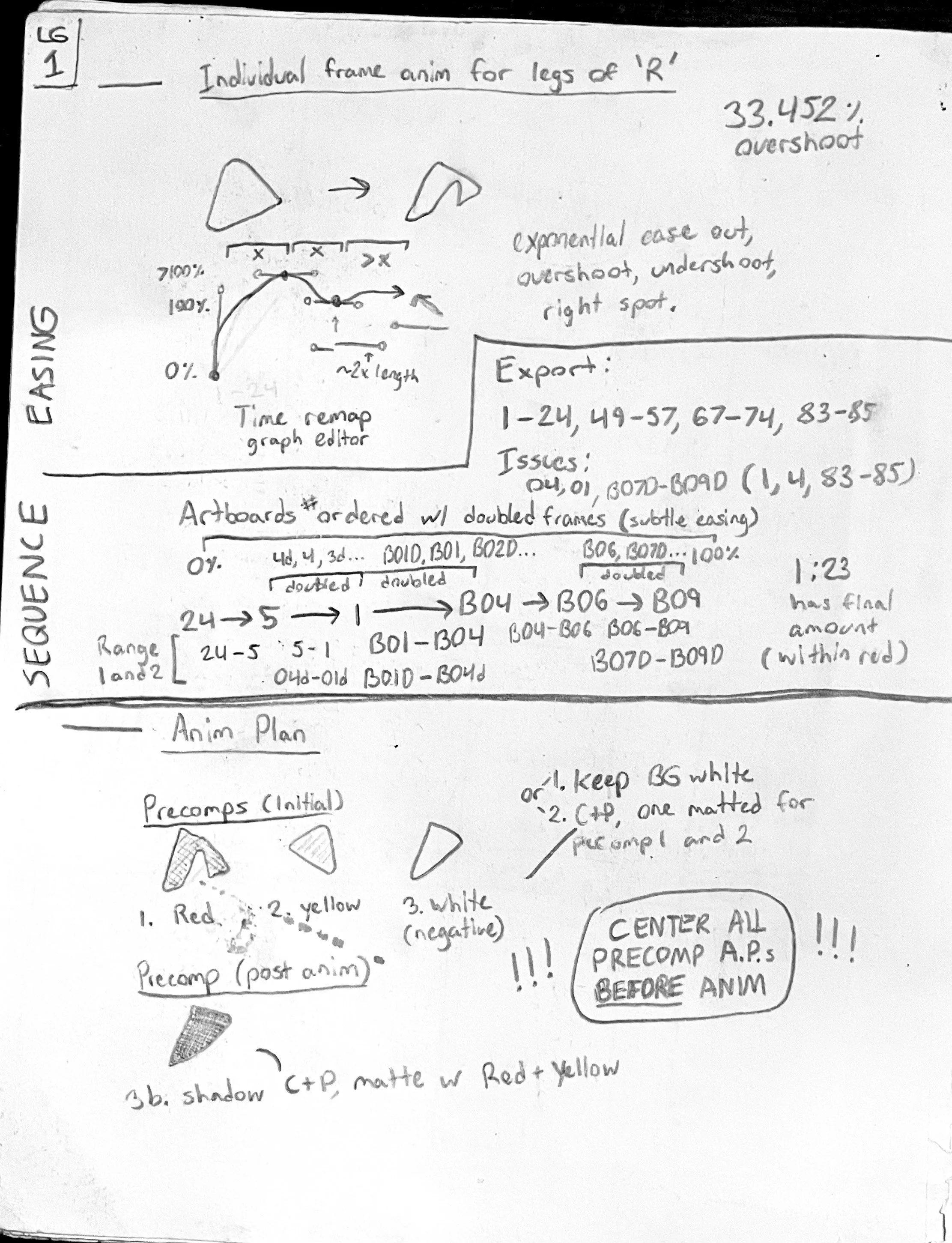 The negative space in the center of the icon was easy enough to convert to a white triangle to animate as positive space, however, the counter between the legs proved to be more of a challenge, as it requires consistent corner rounding as the width changes. The solution I found was to manually create the frames I would need one-by-one, offsetting the movement in consistent increments to create linear motion. Frames were doubled up for the three moments of the animation where the movement slows to a stop to allow for smoother motion. Tthis process was long and required quite a bit to be written down.