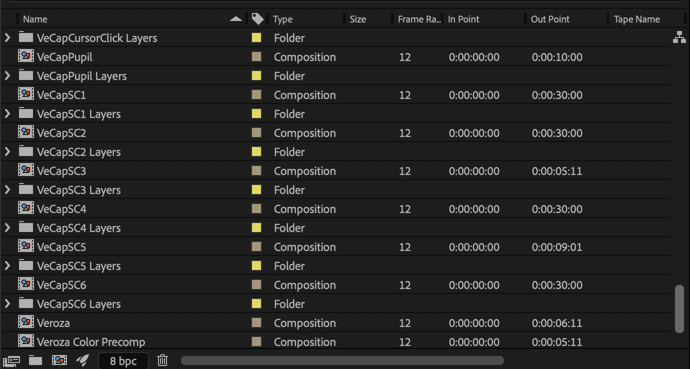Once I was happy with the build of the eye, the assets and PNGs were imported and organized again by composition and the scene(s) they are in.